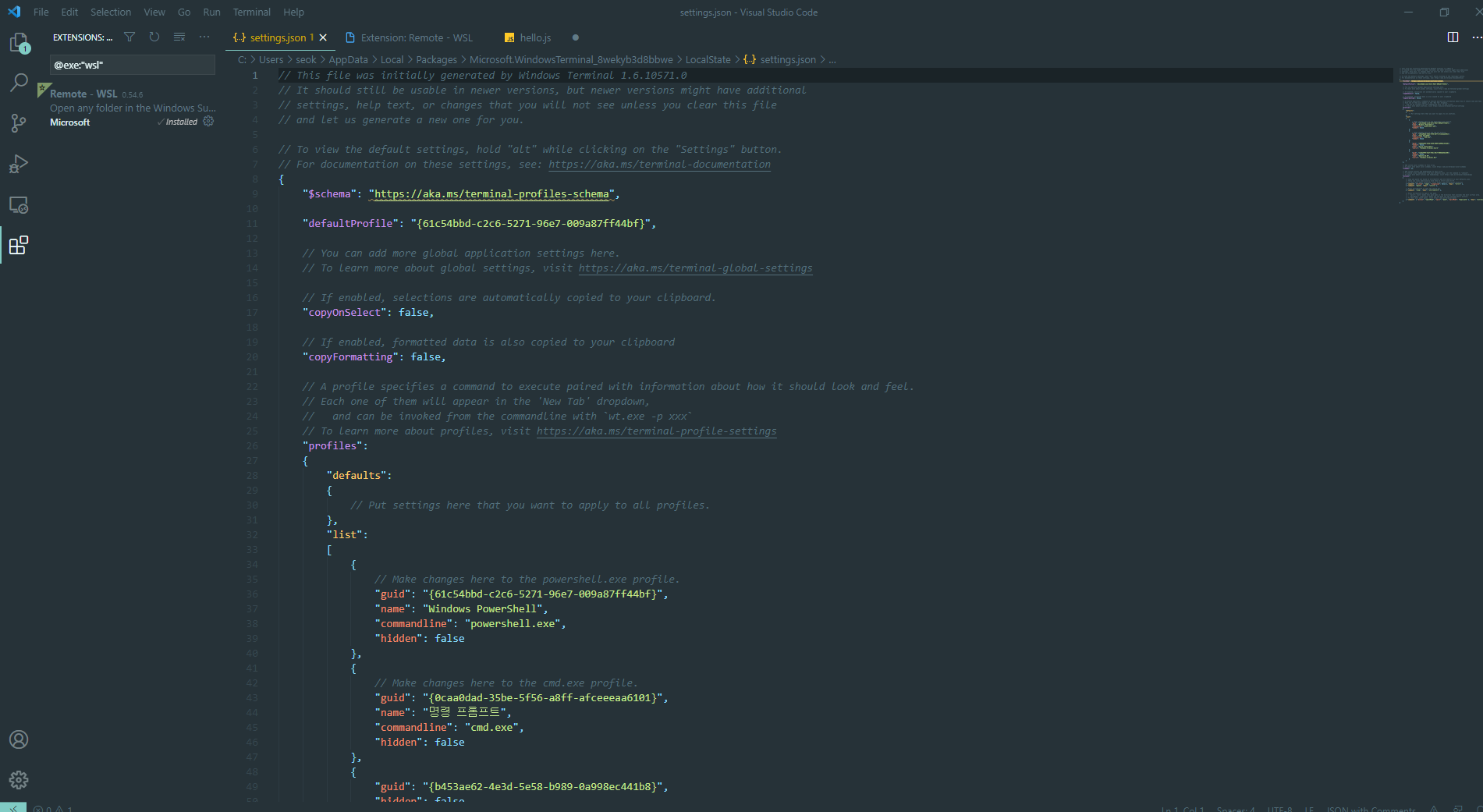 그러면 WSL로 이름이 바뀐것을 확인할 수 있다. 이런식으로 json을 사용해서 커스터마이징을 할 수 있다.