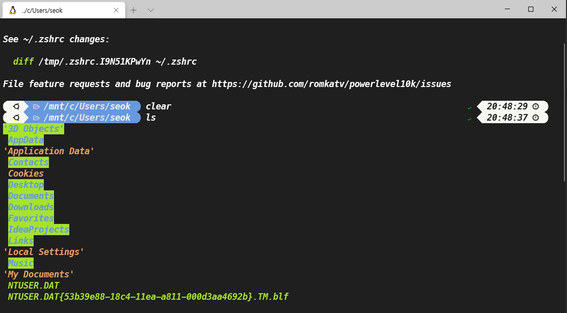 WSL2 터미널의 스킨을 One Half Dark로 설정했다. 그럼 아래와 같이 테마가 바뀐 것을 확인 할 수 있다.